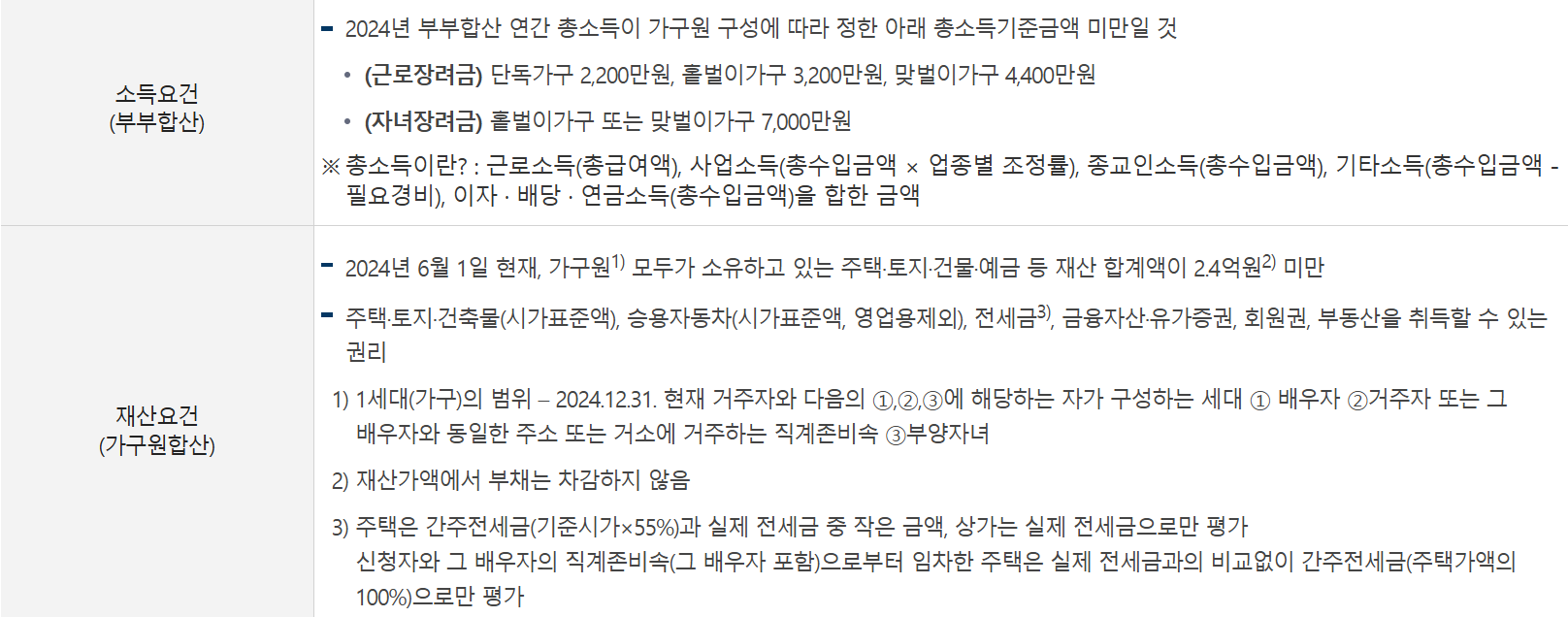 자격 요건: 가구 유형별 소득·재산 기준 충족