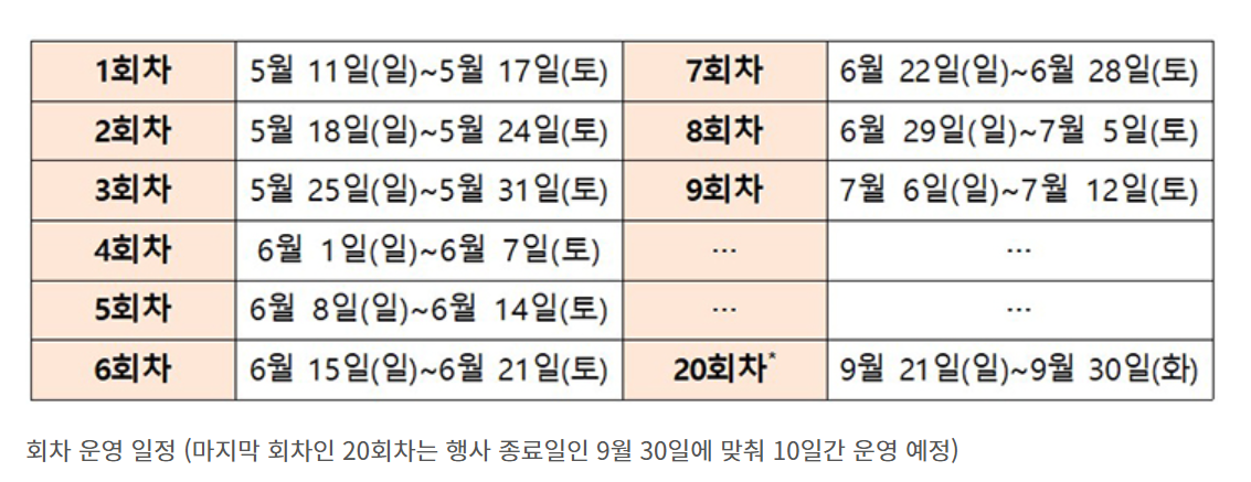 ● 총 20주간, 매주 ‘일요일 ~ 토요일’을 1회차로 설정해 운영