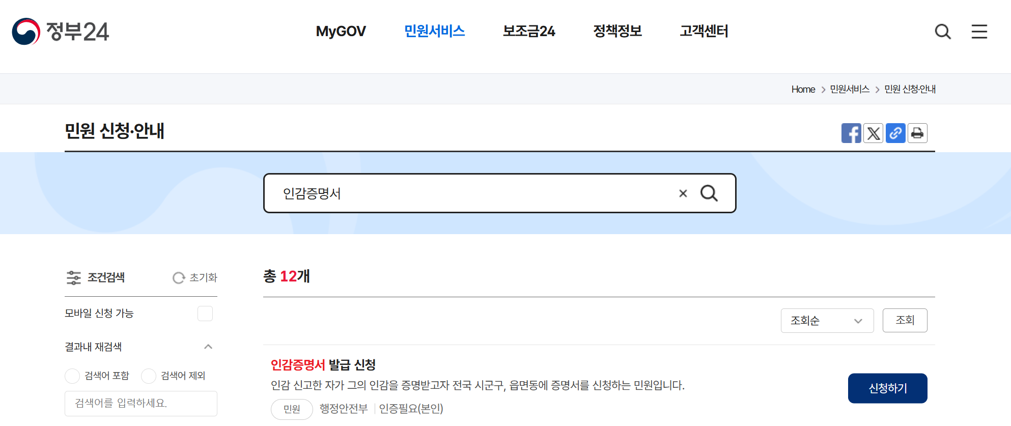 ② [민원서비스] > [민원신청] > ‘인감증명서’ 검색