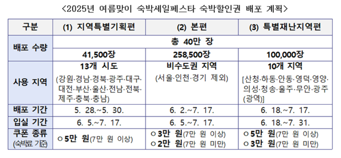 문화체육관광부와 한국관광공사는 2025년 5월 28일부터 ‘대한민국 숙박세일페스타’를 통해 총 40만 장의 할인권을 배포하며, 특히 산불 피해지역 등 재난지역에 대한 특별 지원도 포함되어 있어 그 의미가 더욱 큽니다.