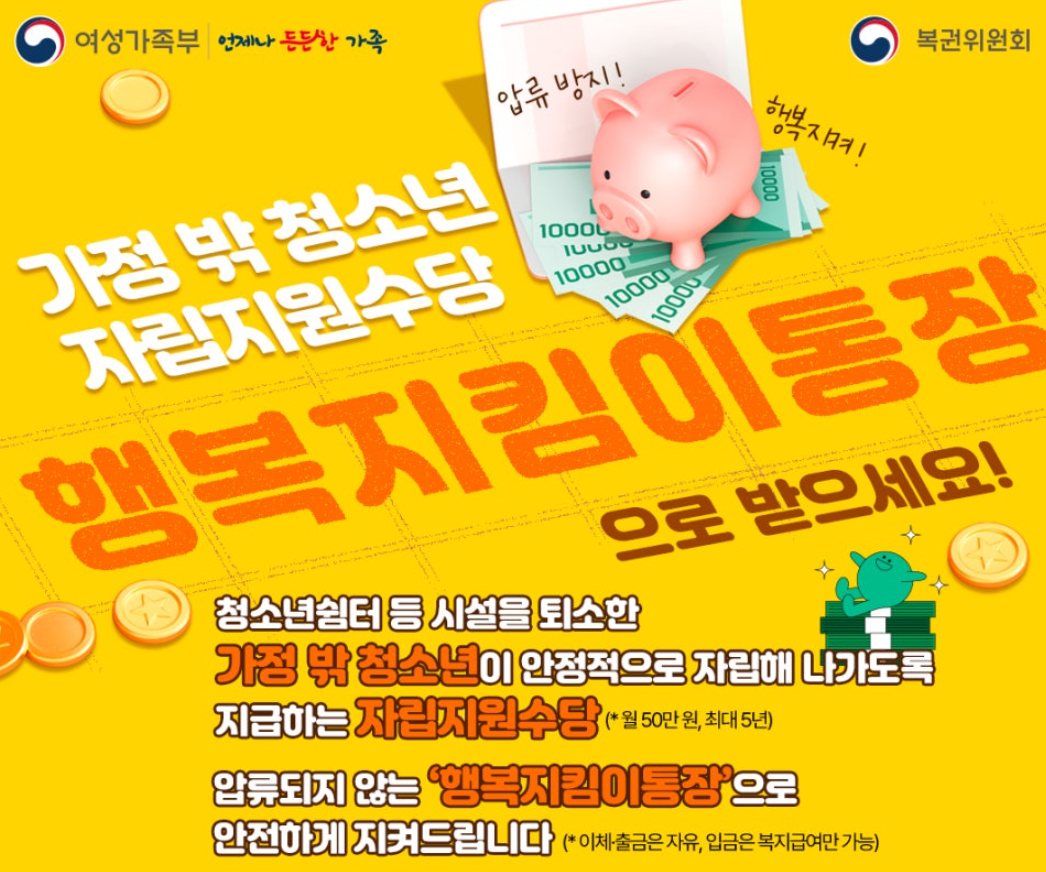 이를 방지하기 위해 정부는 복지급여 전용 ‘압류방지통장’인 ‘행복지킴이통장’을 도입하게 되었습니다. 기존에도 기초생활수급자나 차상위계층에게는 유사한 형태의 압류방지 통장이 있었는데, 이번에는 그 대상이 가정 밖 청소년까지 확대된 것입니다.