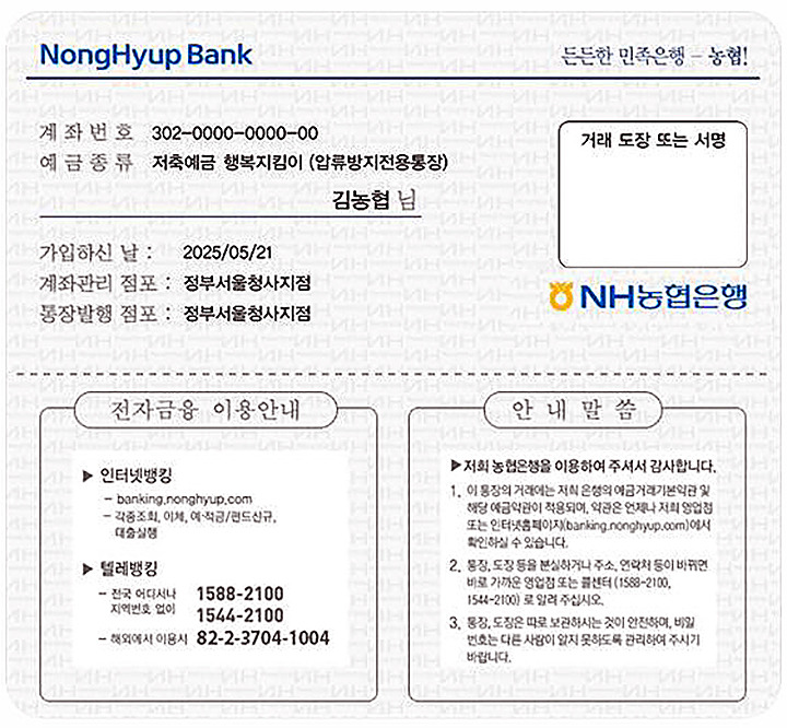 | 통장명 | 행복지킴이통장 (자립지원수당 압류방지 전용) |