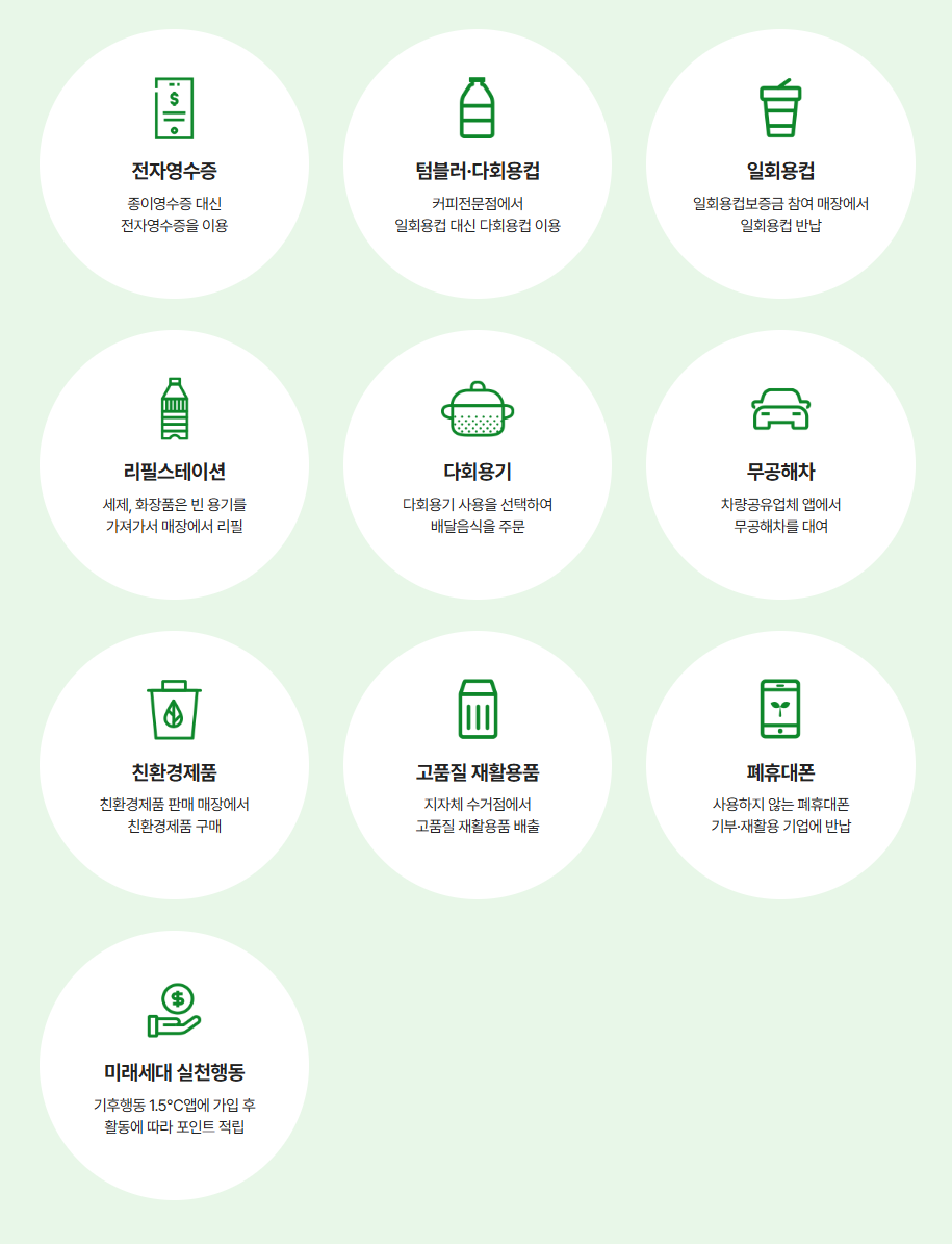 우리 일상에서 실천하는 친환경 소비 행동에 대해 포인트를 적립해주는 정책입니다.