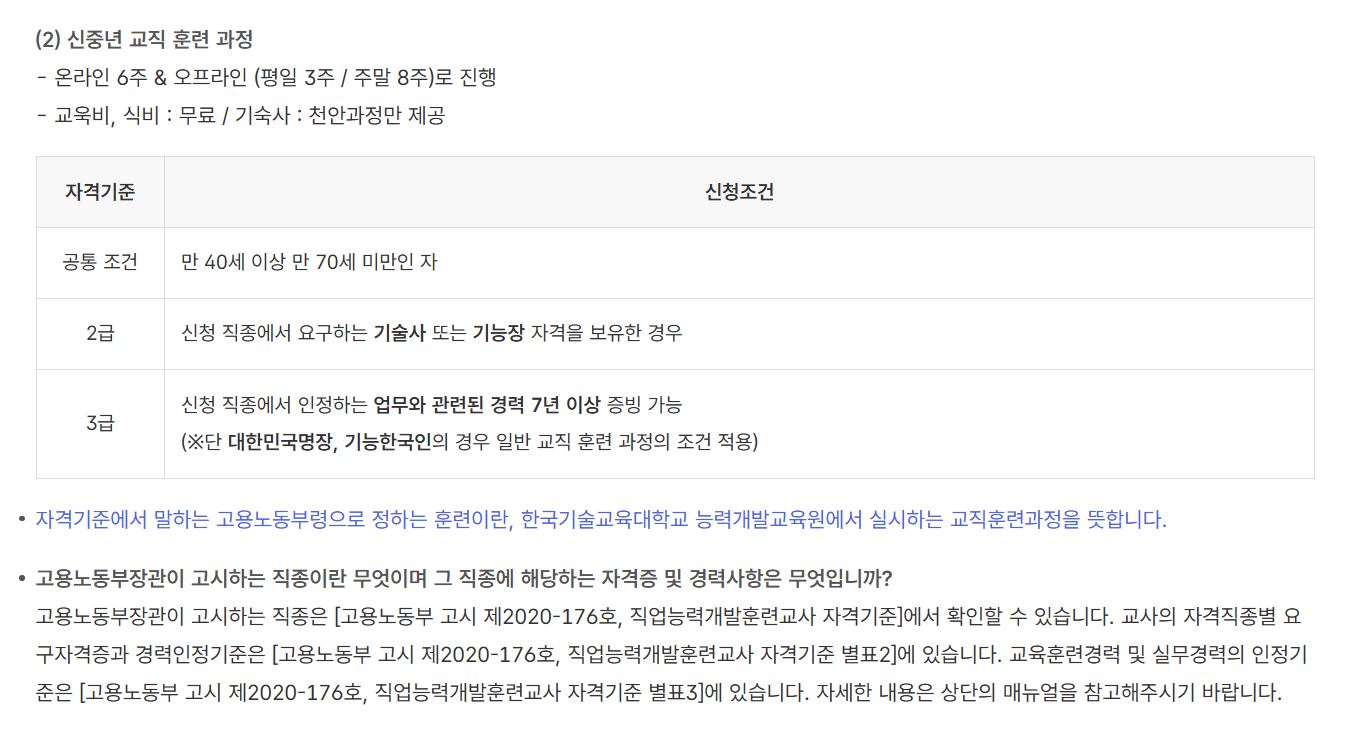 ▪️ 고숙련 은퇴자 또는 은퇴 예정자의 직업훈련시장 진출을 위한 특화 과정