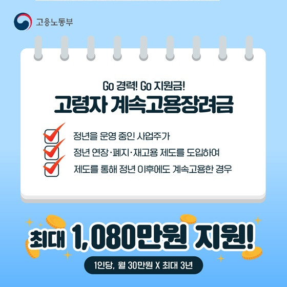 최대 3년간, 월 30만 원씩 지원되므로, 정년 이후 고용을 매달 유지해야 지속적으로 지원금을 받을 수 있습니다.